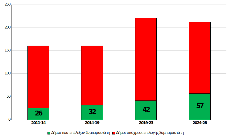 Την προηγούμενη αυτοδιοικητική περίοδο 2019-2023, μόλις 19% των Δήμων που όφειλαν να επιλέξουν Συμπαραστάτη του Δημότη πράγματι επέλεξαν (δηλαδή 42 από τους 221 Δήμους). Τις δύο προηγούμενες περιόδους το ποσοστό διαμορφώθηκε σε 15,5% και 20,4% αντίστοιχα.
